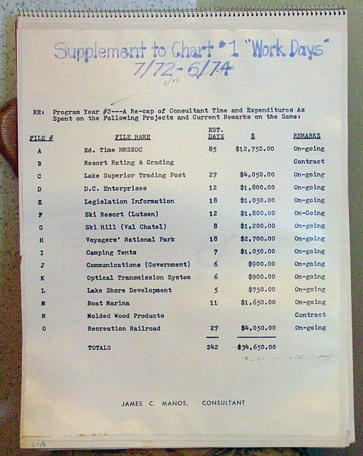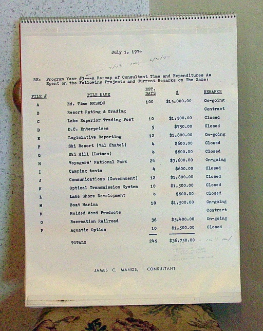 The FBI's entire case against Don was that he had taken or had attempted to take, through mail fraud, kickbacks from his employee James Manos. Who was James Manos? Manos was a businessman from a Chicago business family. Whatever difficulty he had in honestly reporting his income to the IRS he was good at his job as a business consultant and Don valued his skill. Manos had been recommended to Don by an Ely businessman Dennis Cherne who had worked with Don on his extensive study of northern Minnesota's tourist economy. A copy of the resulting book, which served as a blueprint for later tourist promotions in the area, rests in the Library of Congress. Boyd like the charming Manos and hired him to work for the Small Business Center. Manos was paid both for contract work for a fixed fee worked out in advance and consulting work for which Manos was paid $150 a day. By accepting his claim that Manos had worked fewer days, 208 compared to 607 days, a desperate FBI could make the plausible claim that the additional $80,000 he had been paid but failed to report on his taxes had instead been given it back to Boyd as kickbacks. Boyd next had Seivertson make up a chart of the contracts and consulting work that Manos had performed and been paid for.