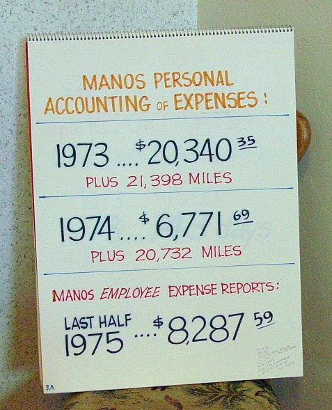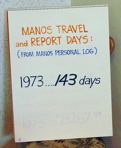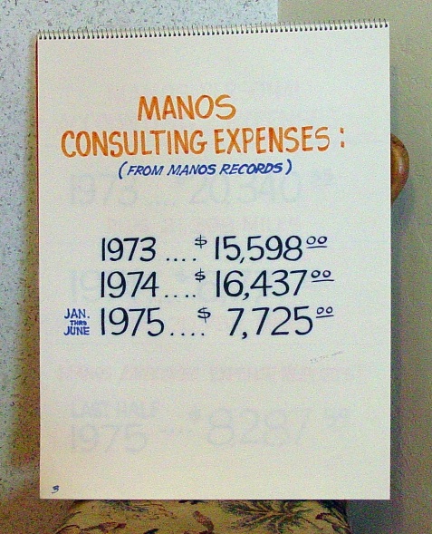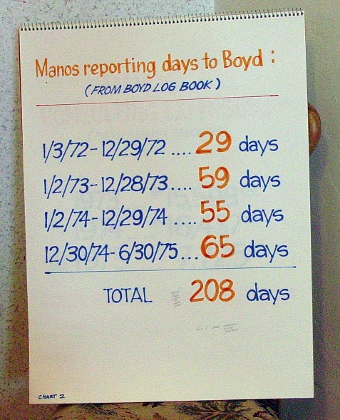 the program year from July of 72 to about the same date the following year. When you add the consulting fees for the second program year to the first you can see that, according to Don's records Manos had been paid $71,400 total. In addition to the time and earnings for Manos' consulting he was also paid for contract work in the amount of $80,750. It was approximately this amount that was never reported to the IRS. The FBI's assumption was that despite any evidence of wrongdoing in his many other business relationships Don Boyd took all of Manos' contract earnings as a kickback. Now it was time to show what James Manos was claiming. These are the days that Don's log book recorded Manos actually reporting to him. It was the same number of days that Manos was claiming he worked. However.........