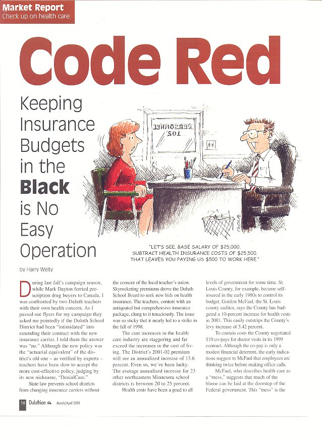 During last fall's campaign season, while Mark Dayton ferried prescription drug buyers to Canada, I was confronted by two Duluth teachers with their own health concern. As I passed out flyers for my campaign they asked me pointedly if the Duluth School District had been "intimidated" into extending their contract with the new insurance carrier. I told them the answer was "no." Although the new policy was the "actuarial equivalent" of the district's old one - as verified by experts teachers have been slow to accept the more cost-effective policy, judging by its new nickname, "DenialCare."