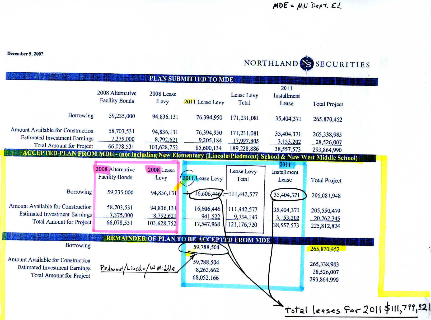The taxes raised so far to pay for the Red Plan are just the beginning. This is the chart that explains the financing. The first row was proposed by the District but not approved by the MDE (Minnesota Dept of Education). The second two rows show what the School Board now plans to do. In the pink box (my colors) you can see the $154 million approved so far this year. This, of course, is shy of the $293 million the plan needs. You can see the rest of the planned spending in the blue box (my colors) That will total $111 million which the Board plans to raise in 2011. At the last Board meeting Gary Glass spoke about these additional taxes only to be interrupted by Chairman Nancy Nilsen who told Gary that the taxes being levied now were it. She told him there was no more to come. Nancy was then corrected by the School District's bond counsel who mentioned that another $90 million would be needed in 2011. Oops! The blue box shows three additional levies in 2011 which will total $111 million in new taxes. This does not include the operational levy planned for this fall. That would be another $6 million a year. The Board may have postponed the additional levy until 2011 to avoid anger over tax increases and to help pass the fall operational levy. However, it puts the Red Plan at risk by giving a new School Board elected in 2009 the power to determine whether it will levy to complete the Red Plan.