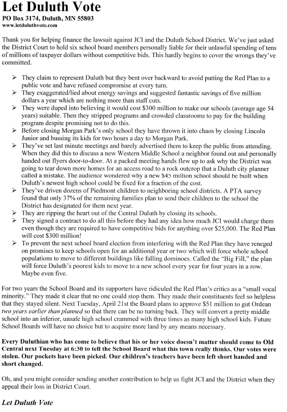 Next Tuesday, April 21st the Duluth School Board will vote to spend $51 million to gut Ordean High School so that no one can stop the Red Plan. In doing so they will create one of the worst high schools in the state as well as one of the most unsafe. They hid an environmental review of the site from the School Board and the conclusions of the Review defy credibility. Let Duluth Vote has sent this letter out requesting Duluth residents to come to that meeting to tell the School Board to reconsider.