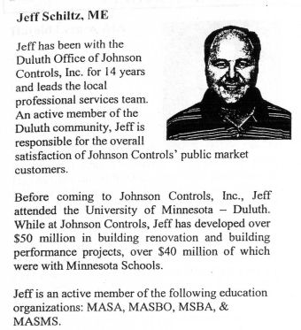 Harry Welty was particularly interested in JCI's claim that Jeff is an "active member" of the long list of educational organizations because he was a member of one of them for the eight years he served on the School Board. The MSBA is the Minnesota School Board Association and the only way one can become a member is by serving on a Minnesota School Board that pays dues to the Association. Jeff has almost certainly set up and manned a vender booth each year at the State Conference but he does so as a salesman not a member of the organization. Also he is apparently a member of MASA. This is the Minnesota Association of School Administrators. If so he is a "business partner" not a true member. If he is a member of MASBO the Minnesota Association of School Business Officers it is as an "associate." The same can be said for MASMS the association of school management professionals. Jeff is a salesman for JCI and thus little more than an exhibitor at the conferences of these organizations. One things stands out on this resume. In 14 years of work for JCI Jeff has had a hand in $40 million dollars worth of building projects. That's just under $3 million a year. With this single sale the Red Plan has added $293 million to Jeff's track record in a single year. He's cooking! Here's an anecdote about Jeff which helps demonstrates his personal commitment to the Duluth Schools aside for the big bucks its Red Plan will earn for him: Early this year a pastor in a Morgan Park church organized a neighborhood meeting with Superintendent Dixon and JCI to answer questions about the Red Plan. Morgan Park is about to lose its only school, Morgan Park Junior High. Someone in the audience asked Jeff where his children went to school. Jeff explained that although he was a Duluth resident he and his wife had originally sent their children to the Hermantown schools. He then explained that they had recently enrolled his children in Duluth's parochial schools.