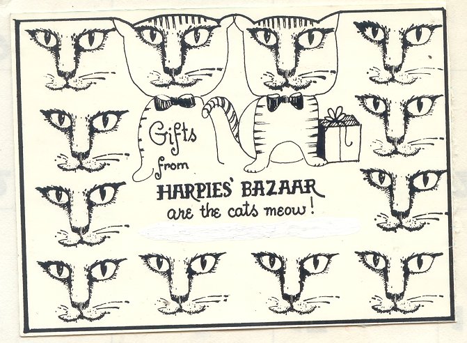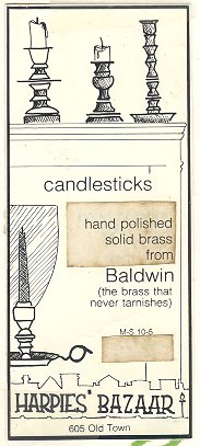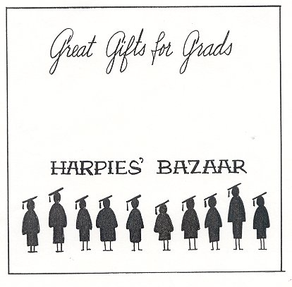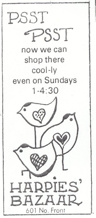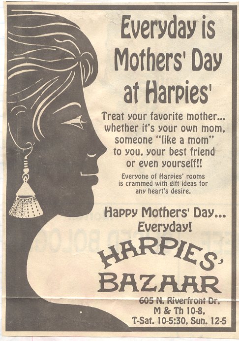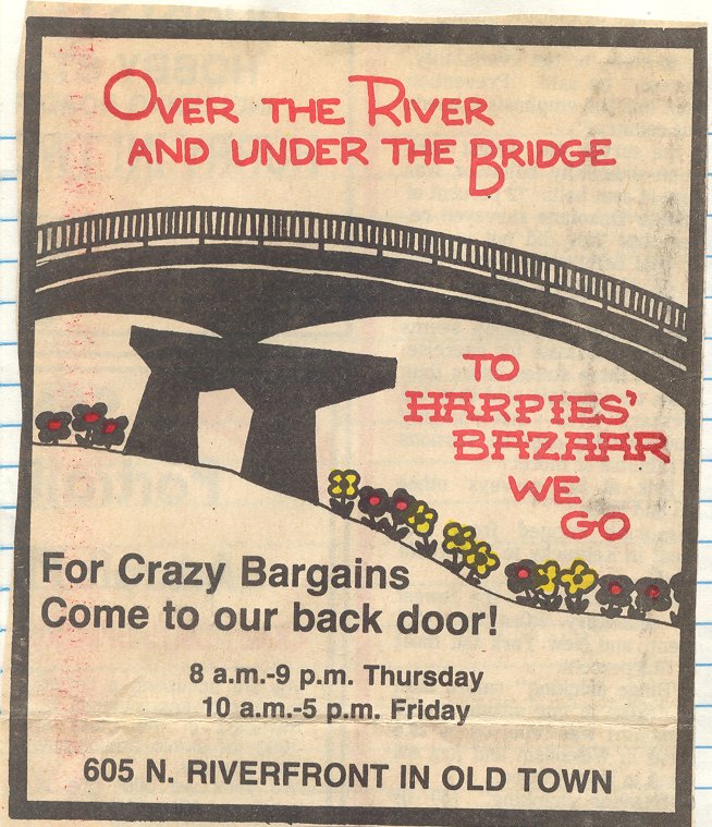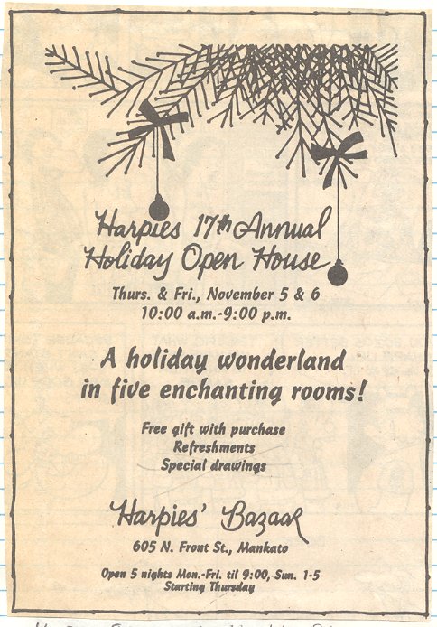 10 Advertising Georganne had worked for about ten years sharing all the responsibilities for the store with the other Harpies. Her early work in Nightengales predisposed her to display. Eventually the Baazar was making enough money to spend on advertising and the other Harpies discovered her talents. From 1983 this she quit Harpies in ??? Georganne drew up dozens and dozens of ads. Over time her graphic eye improved a great deal. The Mankato Free Press won a number of awards based on