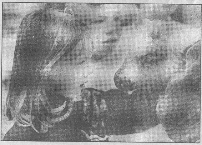 Woodland Hills resident answered questions about raising rabbits as Chester Park third-graders crowd around to stroke the bunny's fur. At right, Keely Welty felt the natural lanolin in the wool of Betsy the lamb.