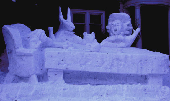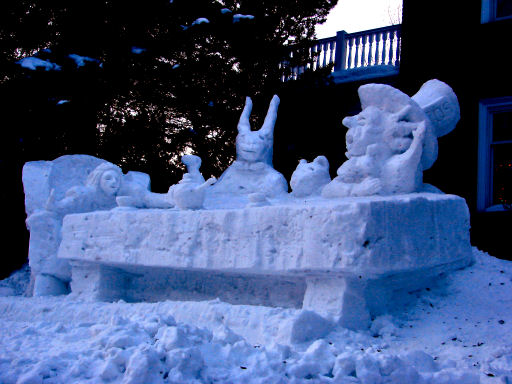 Snow sculptures 2008-09 Alice in Wonderland, The Tea Party - View One The Tea Party - View Two The Mad Hatter in profile I told the reporter for the Duluth News Tribune it was a "hat size."