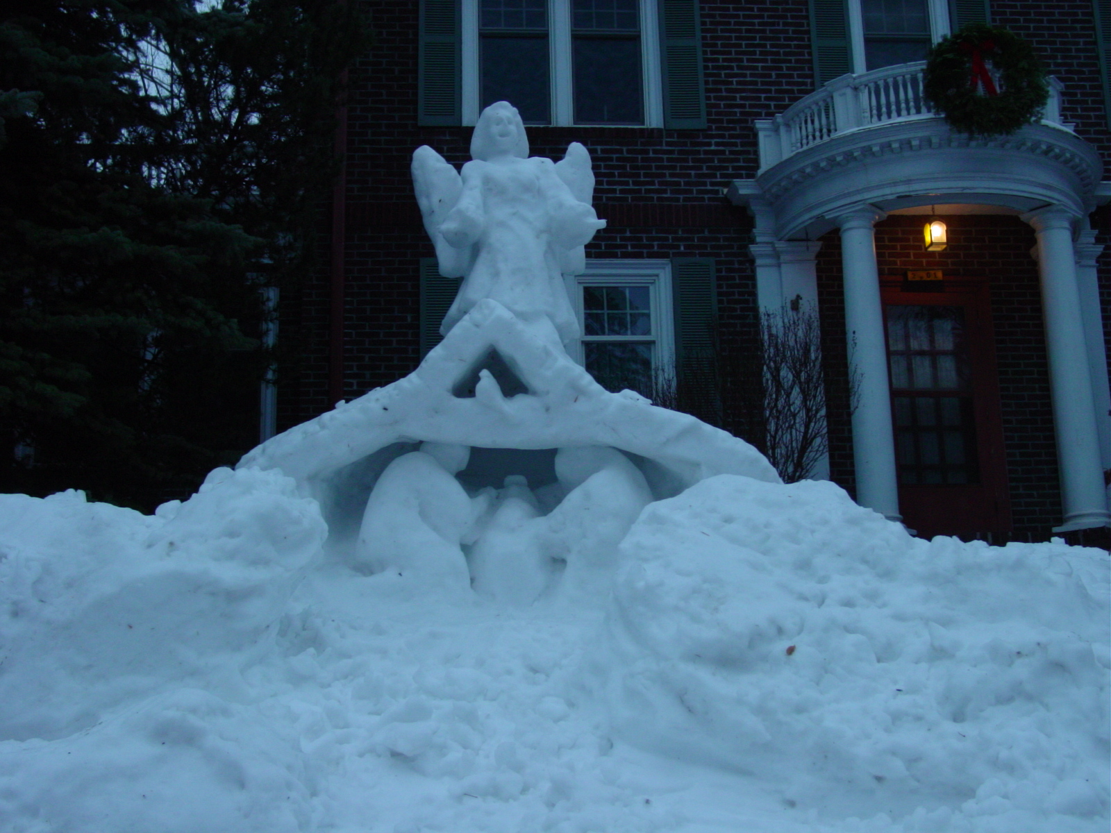 Nativity Scene Details Over several days following a recent snowfall I began piling up snow for a manger scene. I was going to put animals, wisemen and shepherds around the manger and had made some smaller snow piles where the smaller figures might be positioned. I was following the weather reports leading up to making my nativity scene and I was planning for one day of warm weather. I got three instead. On Friday the day before Christmas Eve I piled up snow for an angle which would stand on the back of the stable. Because I was able to find snow that was warm and sticky on the top of the ground snow I was able to scrape it off and build my angel in a couple of hours. On this first day of the melt the lower layers of snow on the gound were not yet sticky. I was able to add wings and sculpt the head. I tried to sculpt the face from the side but it looked like something out of a Picasso painting so I had to rest a step ladder on the roof of the stable and sculpt the face straight on so that I could give it the symmetry people expect of angels. I then started carving the figures of Mary Joseph and the baby Jesus. The snow in the manger's interior was still cold and not sticky. Once I had the figures roughly carved I dug out the manger out behind them creating a large vacant space. This hollowing out heightened the figures by putting the space behind them in shadow . Unfortunately, the warm weather would continue for two more days. By the next morning the roof of the stable had slowly sunk about a foot and a half which made it look as though it was resting on Mary and Joseph. I had to spend the next day, Christmas Eve, rebuilding the manger and touching up the angel's face which looked a bit like the Phantom of the Opera's face. By now the heat had made all the snow on the ground sticky so finding snow to repair the manger was not difficult. After spending several hours rebuilding the manger and the holy family I only had about an hour to finish off the stable animals before hurrying off to sing with the choir in an early Christmas service at our church. I didn't have enough snow for any camels or people but I did have one lump big enough for an ox and four sheep. I had enough time to do justice to the ox but the sheep only got about five minutes each. It shows. I complained to Claudia that I didn't have camels but she explained that by Christmas Eve the wisemen hadn't arrived and the angel was only just calling the shepherds which explained their absence. That made sense. It also reminded me that the three wisemen had actually come to our house a couple years earlier. Perhaps they had read the stars wrong that year. Even so I was sure that they would eventually show up. That evening Claudia had me put votive candles on our steps and a large white candle at the foot of the cradle. They kept burning until morning. I took a picture the following day in bright sun after another twelve hours of evening melt. By noon the angel's head had fallen off taking an arm with it. |