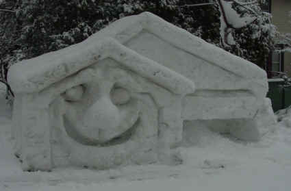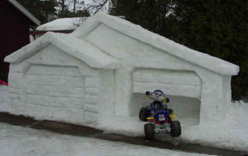 Selling by means of Snow 2005 An acquaintance in the advertising business asked me to make two rather pedestrian snow sculptures for ads he was shooting for clients. The first was an igloo the second a garage. I include pictures of both. The second one the garage being geometric gave me a chance to answer a question I've often speculated about. How much does a snow sculpture weigh? Now I have a better idea. Igloo
