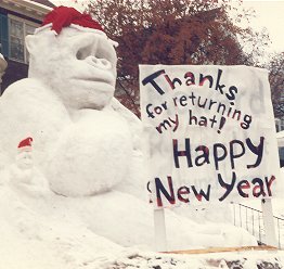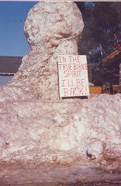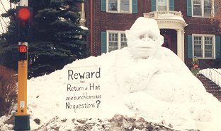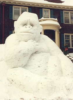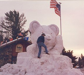 Ten Thumbs Page 10 Disasters Disasters are just part of a day's work in snow sculpting. When the triceratops head you've been working on for a couple hours falls off of the jolly fish you've been sculpting in the middle of the ice skating rink slowly topples over. Its a shame to misjudge the ability of the underlying snow to hold up the head, torso, or whatever that towers above it. I've suffered from these and other lesser problems. Once someone, who obviously didn't like Bill Clinton, knocked off his nose. It was easily repaired. someone put a huge read painted bullet wound in Santa Claus's head. There was so much stain that digging it out and replacing it with white snow turned Santa's beard red But heat is the greatest threat. Of course at home this is only a small disappointment but when the Cable, Wisconsin Chamber of Commerce commissioned me to make a sculpture its melting was a catastrophe. It was meant to welcome skiers to the penultimate North American Cross Country Ski race, the Birkebiner. I decided to make "Snuggles" the fabric softener shill on television. I sculpted a dead ringer for him.