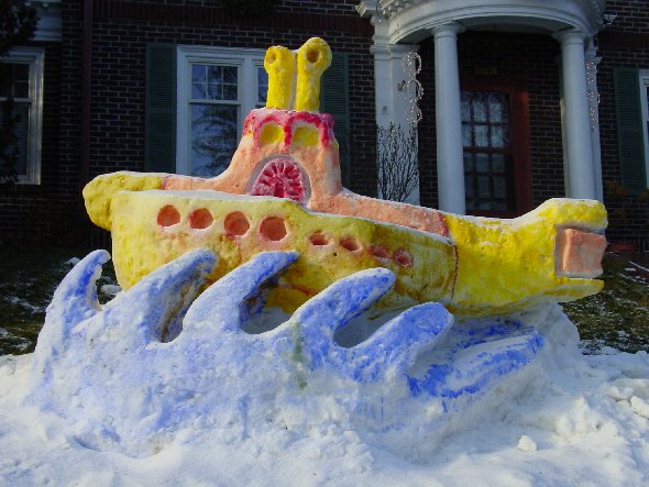 Ten Thumbs Page 9 Coloring Snow For colored snow sculptures its hard to imagine anyone beating this fellow from Norway: Colored snow sculptures and Kurt from Michigan told me how he colors his ambitious sculptures. He uses Spray paint to outline them and then fills in the outlines with ceramic paint. I usually keep my snow sculptures white and when I started I was worried my kids would come in after climbing on my sculptures looking like rainbows. White is the only color they permit at the big international snow sculpting contests but every know and then even I succumb to painting. When George Harrison died in 2002 I decided to do a snow tribute to honor him. A white "yellow submarine" just didn't cut it. It had to be psychedelic! I had used a little food coloring in the past but to get results like those of the Norwegian I used acrylic paint. I have no idea what he uses. I diluted the paint with water into a slurry and used small paint brushes. I avoided spray paint which is probably the preferred method of coloring snow sculptures at colleges around the US during their snow days. Here's what the yellow sub